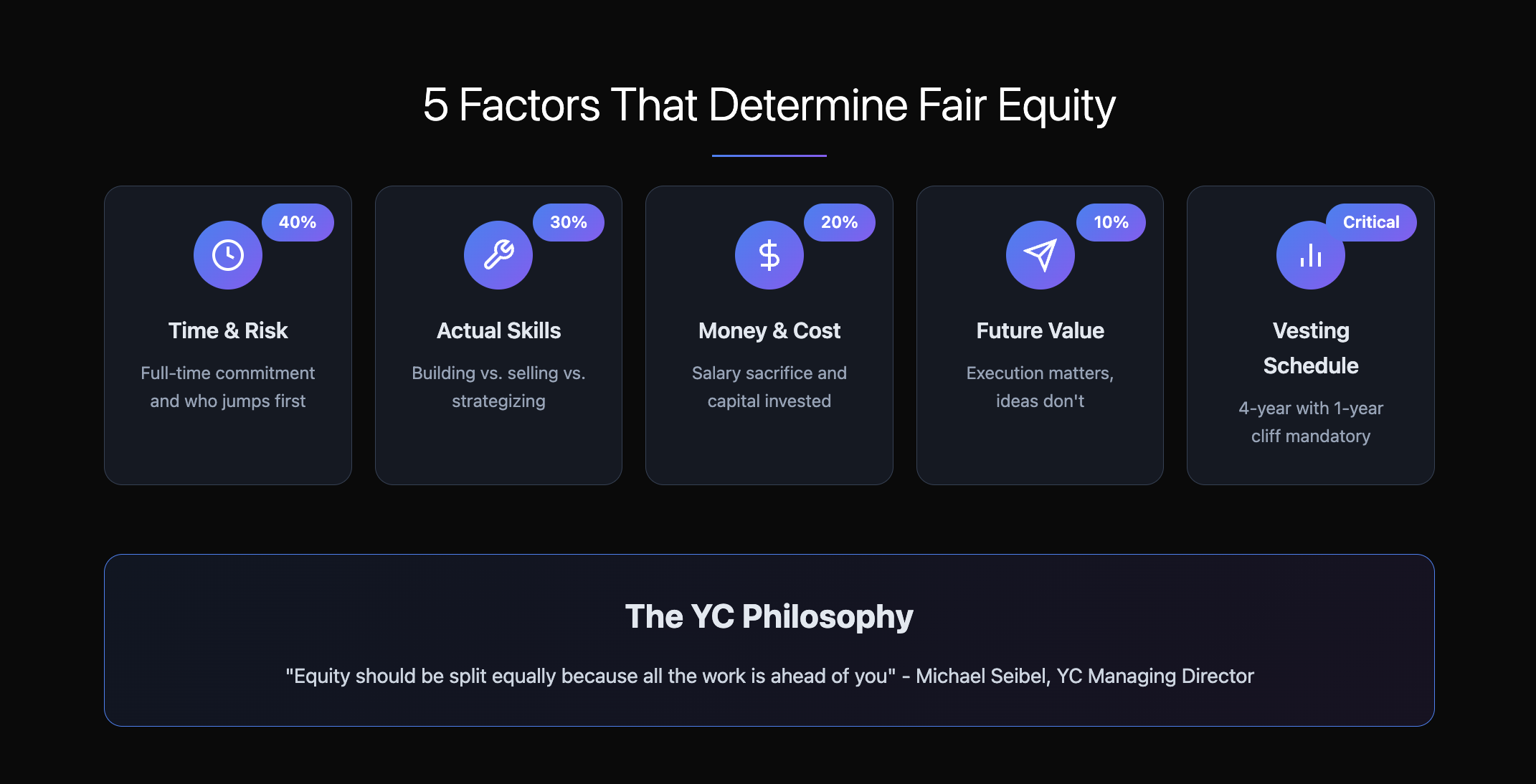 Here's the thing that blew my mind: Y Combinator STRONGLY pushes for equal equity splits. Michael Seibel (YC's former Managing Director) literally said: "Equity should be split equally because all the work is ahead of you."