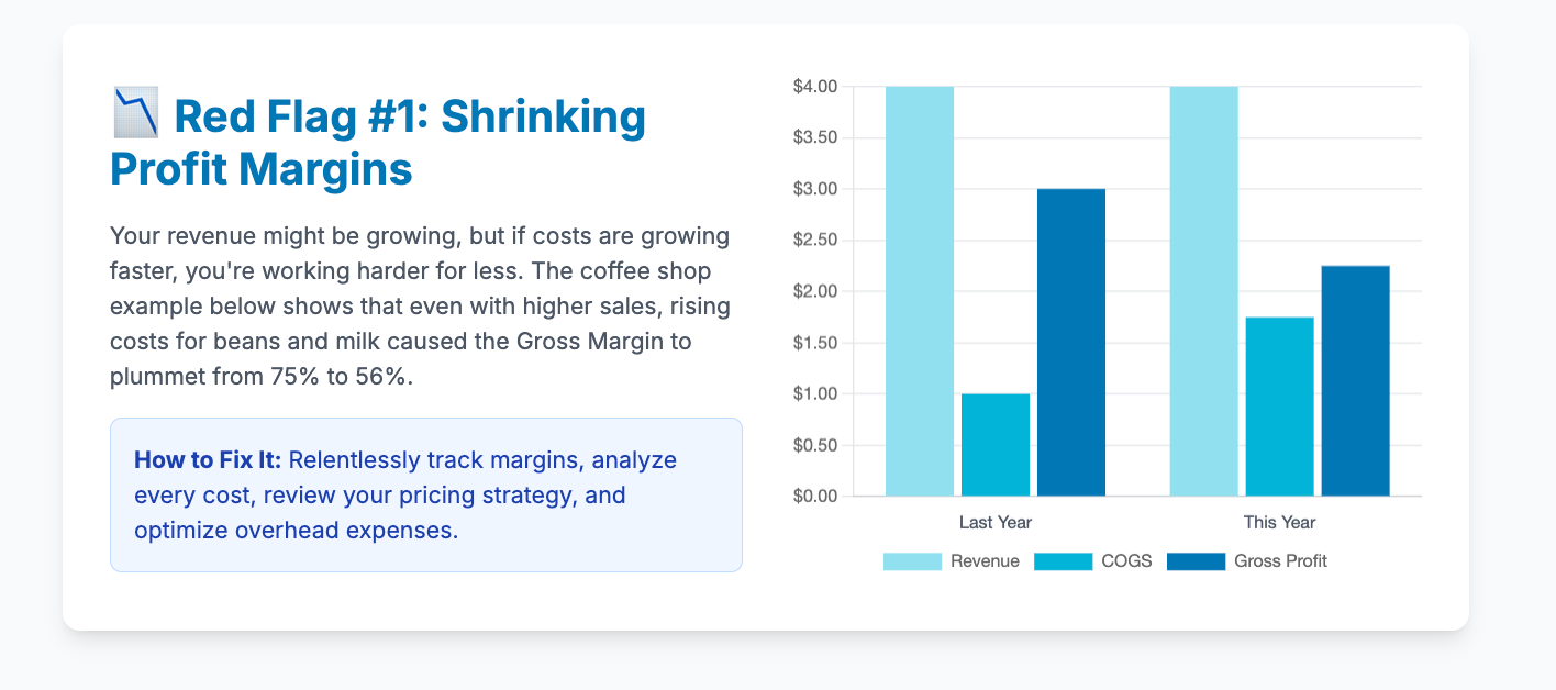 This is one of the most deceptive financial warning signs because, on the surface, things might look great. Your revenue could be growing, you might be busier than ever, and you feel successful. But if the cost of doing business is growing faster than your revenue, you're on a dangerous path. You're working harder for less money, and that's simply not sustainable.