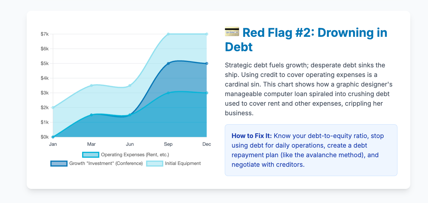 A freelance graphic designer starts her business with a new computer financed on a credit card. That’s manageable. Then, a client pays late, so she uses the credit card to cover her rent. She decides to attend a big conference to find new clients and puts the flight and hotel on the card, too. Soon, she's maxed out. She takes out a small business loan not to invest in new software, but just to make the crushing credit card payments. Her monthly income is now almost entirely dedicated to servicing debt, and she has zero flexibility to handle a slow month or an unexpected expense.