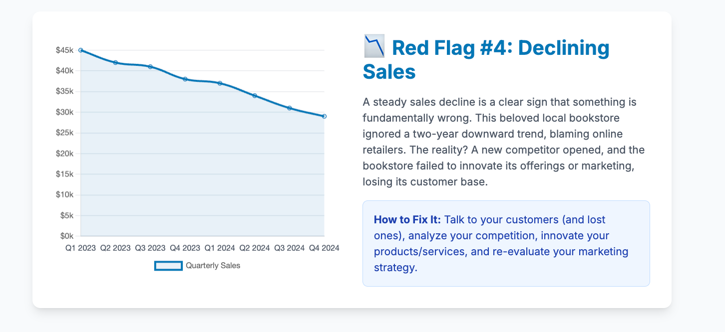 Your market might be changing, a new competitor might be eating your lunch, your marketing might be stale, or your product might no longer be meeting customer needs. Stagnant sales are just as dangerous. A business that isn't growing is, in reality, shrinking relative to inflation and market growth.