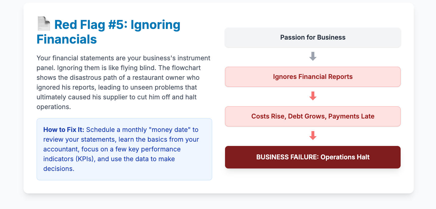 This is the red flag that enables all the others. Your financial statements—the Income Statement (P&L), the Balance Sheet, and the Cash Flow Statement—are the instrument panel of your business. Flying a plane without looking at the instruments is reckless, and so is running a business without understanding your financials.