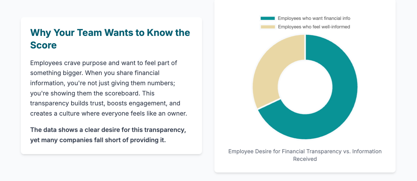 When you share financial information openly, you're not just throwing numbers at them—you're showing them the scoreboard. You're connecting their daily efforts to real business results. This transparency builds trust, boosts engagement, and creates a culture where everyone feels like an owner, not just an employee.