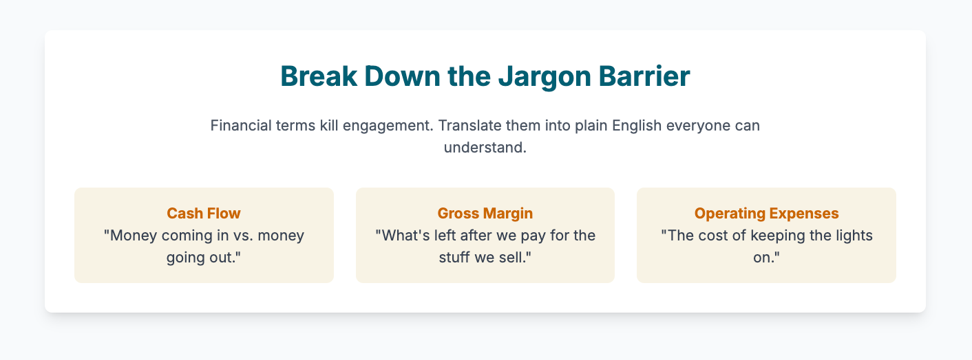 Nothing kills engagement faster than financial jargon. Your team doesn't need an MBA to understand the health of the business. Translate finance-speak into plain English.