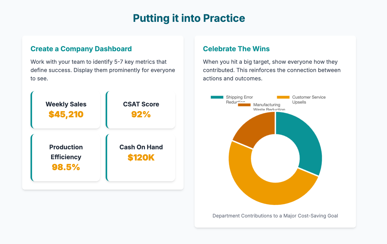 One manufacturing company implemented "Metric Mondays"—a 15-minute standing meeting to review one key number, discuss what influenced it, and brainstorm improvements. Their employee engagement scores shot up by 30% in six months.