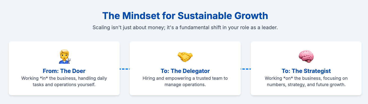 - From Doer to Delegator: You can't do it all anymore. You must hire people you trust and empower them to make decisions. Your job shifts from working in the business to working on the business.