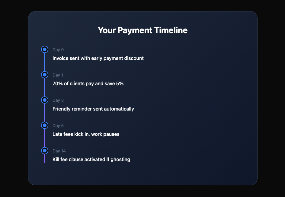 Why it works: Instead of just punishing late payment, this rewards prompt payment. It creates a positive reason to prioritize your invoices and makes ghosting feel like losing money, not saving it.