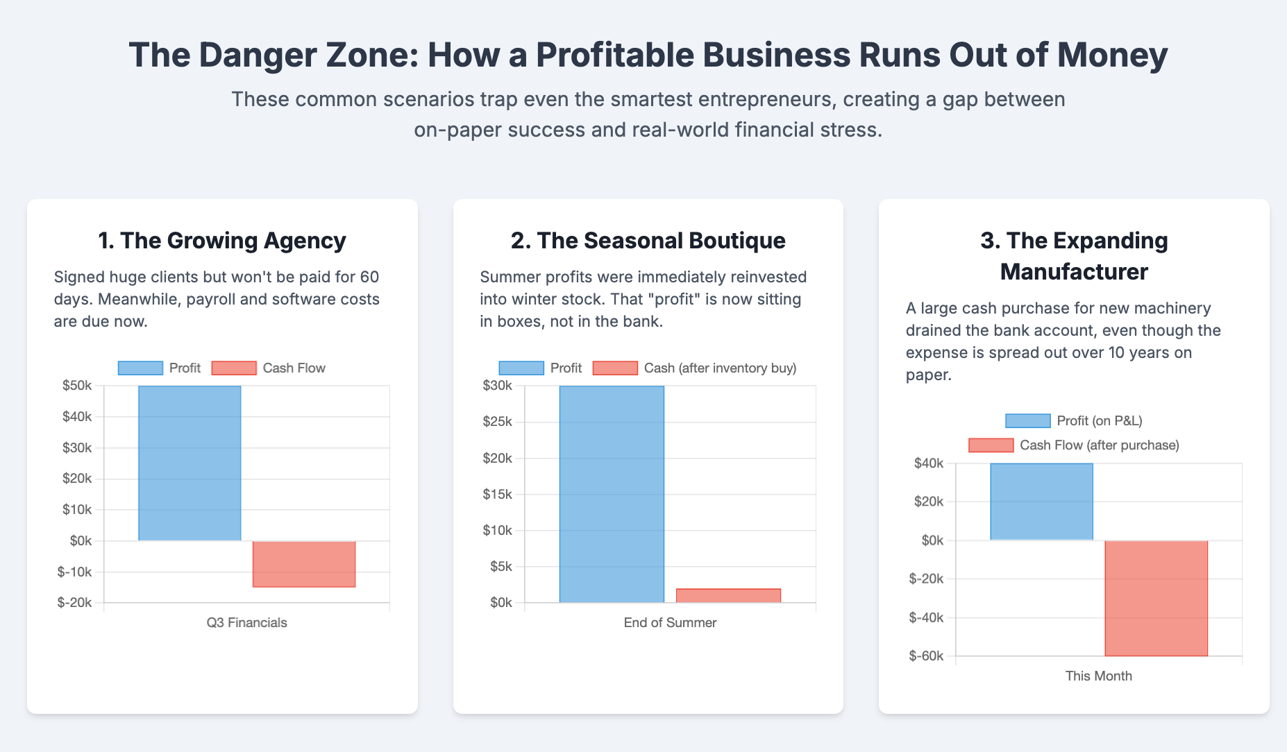 Meet Alex, who runs a small digital marketing agency. Q3 was a record-breaker. He signed three major new clients, and his P&L shows a handsome $50,000 profit for the quarter. He’s officially a success. But Alex is panicking. To service these new clients, he had to hire two new specialists and invest in expensive software licenses, paying for these costs upfront. The problem? His new clients are on a "Net 60" payment term, meaning he won't see a dime from them for two months. His P&L says he's profitable, but his bank account is bleeding cash. He has profit, but no money to make next month's payroll.